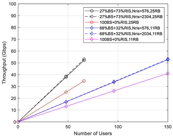 Throughput vs. number of users for the stadium with pitch scenario, with 11 PRB, Ntx = 64, Nrx = 16, two different Nris = 576 (22%RIS), Nris = 192 (66%RIS), and Ptx = 24 dBm.