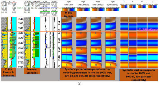 The various modeling scenarios were perturbed using Gassmann’s fluid substitution method. Utilizing rock physics analyses from the well data, we successfully identified the reservoirs and distinguished between various fluid and lithology effects within the study area. This information is succinctly presented in Figure 6a, which showcases a log display summarizing the outcomes of the fluid and synthetic modeling at in situ reservoir conditions. Notably, the AVA Pick domain, highlighted in magenta, represents the location of the AVA (amplitude versus angle) analysis.