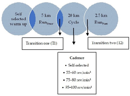 The two transition points, namely, transition one (T1), being the transition from the 5 km run (RunPrior) to cycling, and transition two (T2), being from cycling to RunPost, were timed. T1 involved the athletes removing their running shoes, and putting on their cycle shoes (i.e., clipless pedal-facilitated shoes) along with their bicycle helmet before removing their bicycle from the rack stand. T2 involved the athletes “racking” their bicycle on the rack stand before removing their helmet and cycling shoes before putting on their running shoes and commencing the 2.5 km run (RunPost) The transition time, that is, the time of entry to exit of the transition area, was recorded by the principal author.