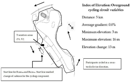 Athlete data were collected under similar environmental conditions (approximately 13–14 °C, 48% relative humidity) as all athletes commenced the initial 5 km run (RunPrior) between 0700 and 0800. These times were intentionally selected due to the overground circuit being free from interference (i.e., vehicles, traffic, owing to the circuit being open to the public). Each athlete commenced the simulated duathlon at individual five-minute intervals (e.g., athlete one commenced at 0700, athlete two commenced at 0705) to avoid the effect of direct competition and to avoid congestion. The start and end points for RunPrior, cycling, and RunPost are shown in Figure 2. The designated start and end point also signified the location where the athletes changed cadence. The same start and end point marked the completion of one 5 km lap, which concurrently marked the start of the next lap (i.e., 5 km). The same overground running and cycle circuit was intentionally designated to avoid increased or preventable braking performance [], as is common in the bicycle segment of a duathlon. Moreover, the overground circuit was commonly used by the athletes for training purposes and is common within the local duathlon and triathlon community owing to the low technical difficulty required to navigate the circuit at relatively high speed (i.e., lack of gradient and sharp turns). Accordingly, as the circuit was frequently used in training and performance contexts, it allowed for the appropriate evaluation of the athletes in a familiar and realistic performance setting. As the circuit was a loop, the athletes commenced and completed both cycling and running at the marked start line outlined in Figure 2. Consequently, total displacement equated to zero in accordance with Equation (1):