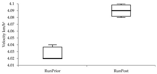 The athletes’ average times for the final 2.5 km in RunPrior and for the 2.5 km in RunPost were 4.03:05 (±0.018) and 4.08:16 (±0.024), respectively (in mm:ss). The 2.5 km in RunPost displayed slower performance times, which may have been influenced by prior cycling (Figure 4).