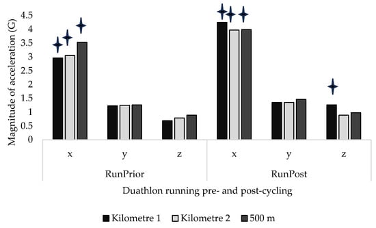 Significant differences were observed in trunk acceleration, that is, the combined mediolateral, vertical, and anteroposterior motion in the final 2.5 km during RunPrior against the 2.5 km during RunPost (p = 0.0093). Analysis revealed that the athletes’ largest variance occurred in the mediolateral direction (x axis) as the athletes displayed a greater magnitude, that is, their trunks experienced greater acceleration, during the initial 1 km of running post-cycling. From here, mediolateral acceleration was seen to increase in RunPost, although not significantly (Figure 5).