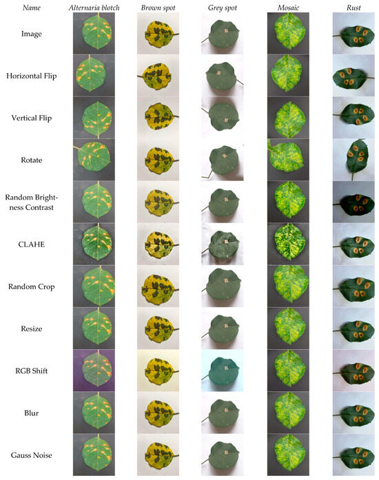 After annotation was completed, 1623 images were randomly selected as the training set, and images were enhanced using the algorithm’s data augmentation library, a Python library used for image enhancement. The purpose of image enhancement is to create new data samples from existing datasets. Increasing training samples can help the model learn more effective features and effectively prevent overfitting. A total of 12 enhancement methods were used to expand the dataset, including horizontal flipping, vertical flipping, random flipping (maximum 90 degrees), random brightness and contrast adjustment, contrast limited adaptive histogram equalization, random cropping, resizing, random RGB value changes, blurring, Gaussian noise, tone separation, and random adjustment of image tone and saturation values. The expanded training set had a total of 21,099 images, and the expanded effect is shown in Figure 5.
