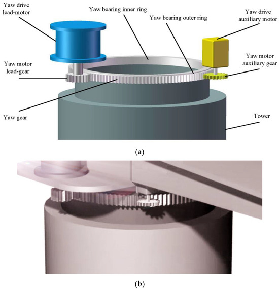 Figure 1 shows the main structure and components of the yaw system. The conventional medium-sized yaw system was configured and installed with only two yaw drive lead motors that were fixed to the initiative (active) driving unit. The two yaw drive auxiliary motors were specially configured and installed in the present study, which were embedded in the passively driven unit and located between two active motors, as displayed in Figure 1a,b. Figure 1b is the engineering schematic diagram with the auxiliary motor embedded in the driven second unit. The first unit includes the rack and its ancillary equipment as well as the engine compartment, while the driven second unit only includes the engine compartment and its sealing components [28].