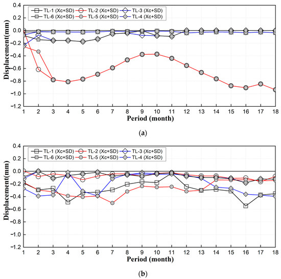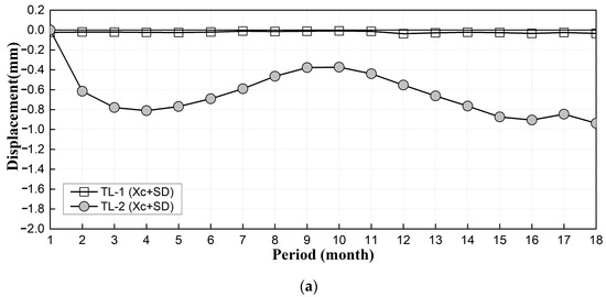 An analysis of the maximum vertical displacement by section revealed that in Section A, the TL-1 sensor measurement was close to 0, as shown in Figure 6a. However, the vertical displacement of sensor TL-2 increased significantly during the 2nd to 3rd months of measurement. In addition, the trend decreased until the 9th to 10th months of construction and then increased until the 18th month. In Section B, as shown in Figure 6b, the change in vertical displacement was more significant for sensor TL-1 than for sensor TL-2. In Section C, no significant change in the displacement was observed for sensor TL-1, as shown in Figure 6c. However, the displacement continued to increase until the 6th month of measurement with sensor TL-2; nonetheless, the change in displacement until the 18th month of measurement was not significant.