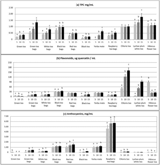 Anthocyanin levels decreased (p < 0.05) in green tea infusions after ten minutes of brewing compared with five minutes; brewing time extended to fifteen minutes did not contribute to further reductions in anthocyanin content (Figure 1c). A linear increase (p < 0.05) of the anthocyanin content with brewing time was found in green bags, white, red and black leaf tea infusions. Anthocyanins levels increased (p < 0.05) in black tea bags, raspberry tea and butterfly pea tea infusions after ten minutes of brewing compared with five minutes; brewing time extended to fifteen minutes did not contribute to increasing the anthocyanin content of tea infusions compared to levels reported for ten-minute brewing. In yerba mate infusion, more (p < 0.05) anthocyanins were not measured earlier than after 15 min of brewing. The hibiscus flower infusion showed a linear decrease of anthocyanin content with brewing time. No effect of brewing time on the anthocyanin content of white lychee plum tea infusion was recorded.