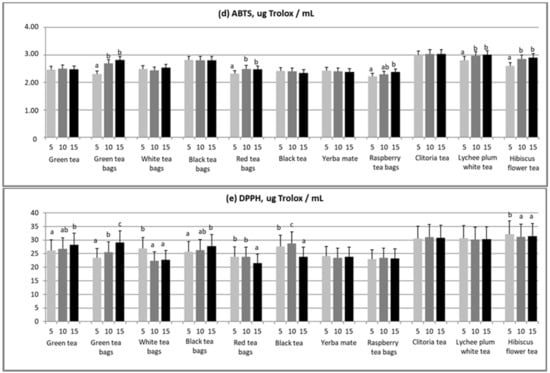 A linear growth (p < 0.05) of the capacity of DPPH to free radicals away with the extended brewing time was only found in green tea bags infusions (Figure 1e). In green leaf tea and black tea bag infusions, a significant increase in DPPH capacity to free radicals away was only recorded after 15 min of brewing. In the black leaf tea infusion, DPPH activity after ten minutes of brewing increased (p < 0.05) more than after five minutes of brewing; however, after fifteen minutes, the capacity of DPPH to free radicals away significantly decreased compared to the level reported after five and ten minutes of brewing. In the red tea bags infusion, the DPPH capacity to free radicals away was significantly lower after fifteen minutes of brewing compared with that after five and ten minutes, but ten minute brewing time had no significant effect on DPPH capacity to free radicals away compared to five minutes. In the white tea bags and hibiscus flower tea infusions, the capacity of DPPH to free radicals away was significantly lower after 10 and 15 min of brewing compared with that after 5 min, but no difference (p < 0.05) was identified between 10 and 15 min. No significant effect of brewing time on DPPH capacity to free radicals away was found in yerba mate, raspberry tea, butterfly pea flower tea and white lychee plum tea infusions.