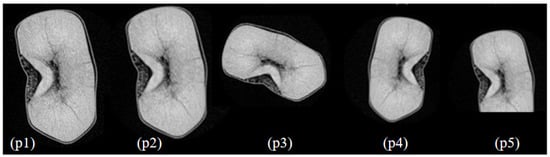 Image segmentation was a crucial step in the 3D visualization of the maize kernels as it involved separating each tissue of the kernel from the background region. Due to the indistinct boundary contours of each tissue in the corn kernel slices, we employed an interactive threshold segmentation algorithm [] to segment the kernel image layer by layer. In this study, the corn kernel, embryo, endosperm, and seed coat were segmented using a thresholding technique. As the amount of mold on the corn seed coat and endosperm increased, segmentation became more challenging, and only the seed coat and endosperm could be segmented together as a whole. The segmentation included pores and cracks in these four areas. As shown in Figure 1d,e.