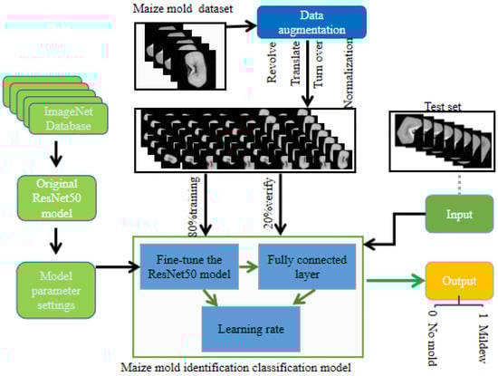 In this study, a ResNet50 model was developed for the rapid detection of maize mildew, and Figure 4 illustrates the fine-tuning process of the model. Optimization was performed using an optimizer with stochastic gradient descent with momentum (SGDM) with an initial learning rate of 0.01. The learning rate was reduced by a factor of 0.2 every five cycles, with a minimum batch size of 128. A maximum of 30 theses were trained and validated using 1 iteration per 50 each. The original ResNet50 model was trained on the ImageNet dataset to obtain model weights, which were then loaded into the final fully connected layer. The ResNet50 model for recognizing and classifying corn kernel mildew was fine-tuned using an expanded image dataset augmented with additional data. In this process, 80% of the images were used for training and 20% for validation in the training set, which was constructed based on the classification of corn mildew detection. The 2D grayscale image slices of each corn kernel were utilized as a test set to evaluate the ResNet50 model for detecting corn mildew. The model output a value of “1” for a mildewed image and “0” for a mildew-free image and then calculated the proportion of images with mildew features in the results. By calculating the proportion of images with mildew features in the results, the degree of mildew in maize kernels could be classified as light, medium, or heavy.