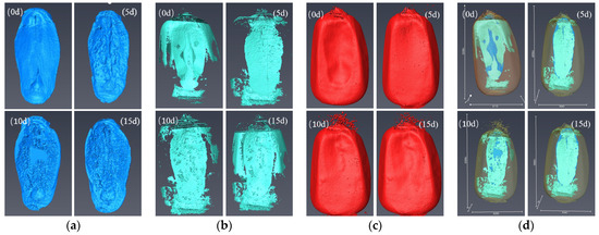 Structural 3D model of corn kernel sample (0 d)–(15 d): (a) embryo model, (b) pore and crack model, (c) endosperm and seed coat model, (d) grain model.