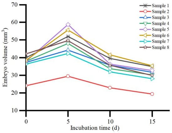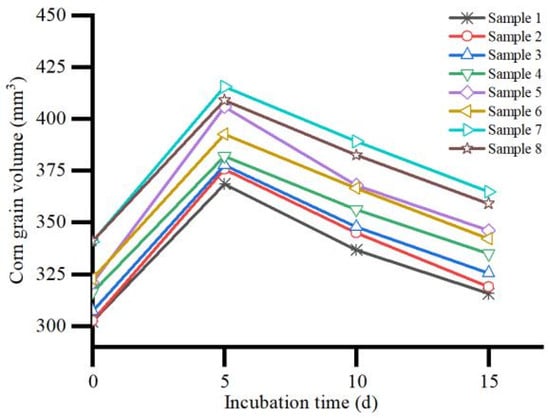 The volumetric parameters of maize kernel volume, embryo volume, endosperm, and seed coat were extracted from maize samples collected from 0 to 15 d after pollination. These three sets of volumetric parameters were quantitatively analyzed and plotted, as shown in Figure 7, Figure 8 and Figure 9, with trend and standard deviation plots of the volumetric parameters. The analysis revealed that the three groups of volumetric parameters for each sample increased at 5 d compared to the initial kernel. The volumetric parameters for each maize sample exhibited a consistent pattern of initial increase followed by a decrease during the incubation stage. It can be seen from Figure 7, Figure 8 and Figure 9 that with the passage of time in the mold culture, the parameters of grain volume, embryo volume, and endosperm volume of eight groups of corn grain samples increased initially and then decreased. This was because corn mold requires corn grains to absorb external water, leading to a gradual increase in the volume of corn grains, embryo, and endosperm during the moisture absorption stage of corn grains from 0 days to 5 days in this experiment. After the fifth day of culture, the metabolic activity of mold in maize grains increased dramatically. This led to significant consumption of water and biological media in the maize grains, resulting in a decrease in the volume parameters of the maize grains, embryos, and endosperm.