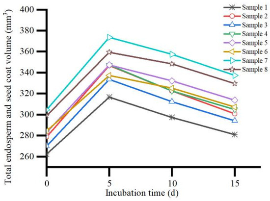 Volume change diagram of the total volume of endosperm and seed coats of corn kernels.