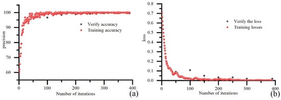 Based on the two-dimensional sliced grayscale image of a corn kernel obtained by X-ray tomography, mold and mold-free feature images were extracted. The ResNet50 model was enhanced for the rapid detection of corn mold. The training accuracy and validation accuracy of the ResNet50 model varied during training, as depicted in Figure 10a, and the classification loss also varied during training, as shown in Figure 10b. With iterative adjustments, its training accuracy exceeded 99%, and the classification loss was less than 0.1.