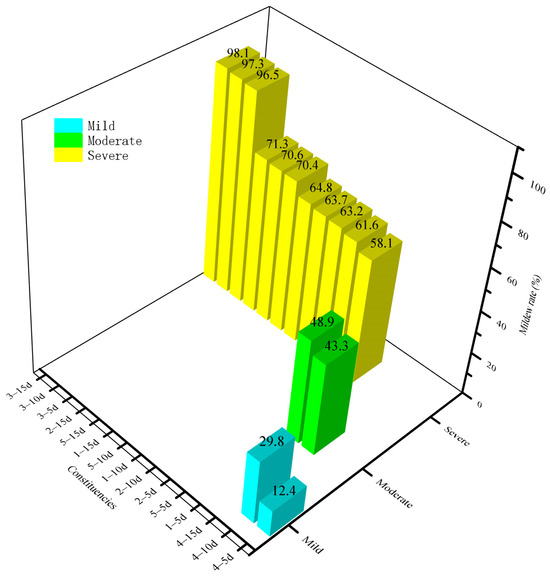 The enhanced ResNet50 model was utilized to detect and identify 1000 images without mildew features and 1000 images with mildew features selected from each set of maize kernel slice images from 0 to 15 d, with 93% accuracy on the test set. The ratio of images with mildew features to the entire set of sliced images of maize kernels was utilized as a parameter to distinguish the degree of mildew. Mild mildew was designated as 0–30%, moderate mildew as 30–50%, and severe mildew as greater than 50%. Five groups of corn kernels were sampled from the 5-d, 10-d, and 15-d sections of the image set. A total of 100 to 1300 images were taken for mildew detection, and the results are shown in Table 2 below. The percentage of mold images detected in each group was calculated and plotted in Figure 11. The comparison of group 3 with the other groups in Table 2 indicates that the degree of mold in different maize kernels was not dependent on the incubation time but was closely associated with the amount of bacteria present on the maize seeds themselves. Figure 11 shows that 4–5 d and 4–10 d were mild mold, 4–15 d and 1–5 d were moderate mold, and the remaining groups were heavy mold.
