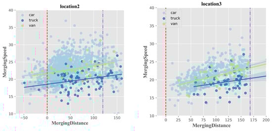 As the merging position moves forward, the higher the vehicle merging speed. The car’s trend line is at the top, located on the upper left; the truck’s trend line is at the bottom, located on the lower right; and the van’s trend line is in the middle, between the car and truck.