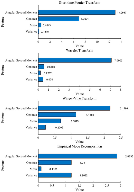 The improved LIME method is used to explain the trained network, and the interpretation results are shown in Figure 9. The Y-axis coordinate in the figure is the feature name, and the X-axis coordinate is the coefficient value of the trained model g. This value reflects how much the network depends on the corresponding feature when making a decision. The larger the value, the more attention the network pays to that feature when making a decision. It can be found that when the time–frequency images with rich texture features formed by STFT and wavelet transform are input into the network, the main basis of network classification is related to texture features. When the clearer time–frequency image formed by SST is used as the network input, the main basis of network classification is more inclined toward the irrelevant feature of image brightness.