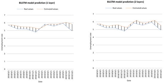 As the output sequence of the forward LSTM layer is commonly obtained as the unidirectional one, the output sequence of the reverse LSTM layer is calculated using the reverse inputs from time to time . These output sequences are then fed to the function to combine them into an output vector [29]. Similar to the LSTM layer, the final output of a BiLSTM layer can be represented by a vector, , in which the last element, , is the estimated unemployment rate for the next iteration.
