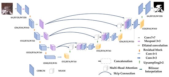 As shown in Figure 2, MSACN is a U-shape structure including an encoder and decoder components, which are multi-scale Concurrent Dilated Residual Convolution Module (CDRCM) and Multi-head Soft Attention Module (MSAM), respectively. The MSACN is taking inspiration from U-Net as a whole. In addition to the core modules parts (CDRCM and MSAM), other backbone parts refer to ResNet50. Its expansion path and contraction path also have a corresponding relationship. Thus, the feature extraction part uses the residual module to deepen the model without loss of resolution and learn more complex features to reinforce the representation ability of the model. Before inputting the feature extractor part to the cloud semantic prediction module through skip connection, the shape is changed through convolution to adapt to the prediction module, and CDRCM is used in the first convolution to expand the field of view and preserve the spatial resolution. The input layer has the richest and most primitive features, and the reflected features are not lost due to processing. Therefore, the dilated pyramid-like unit is built for the original input image to control the scale difference by the dilation–convolution factor in order to improve the shape-scale in-variance performance. A series of multi-head attention modules are added to the cloud semantic prediction module. The multi-head attention of the decoding process belongs to the soft attention mechanism. Through the combination of multiple heads soft attention blocks, the depth semantic features of the cloud are strengthened and make them more approximate to be linear separable features. The multi-head soft attention module consists of these white blocks, as shown on the right half of the structure in Figure 2. Each multi-head attention module is based on concatenated features. It receives two inputs from the encoder and decoder parts, and performs splicing and convolution operations on its output and upsampling results to ensure the depth of the network. The attention mechanism believes that features at different levels in the network have different importance, and by assigning greater weight to important features, it can inform subsequent layers to focus more on the interested information and suppress useless information. This improved method trains the network to more accurately capture the spatial location information and boundary details of clouds, thereby enhancing the model’s accuracy. Through multiple operations of upsampling and attention modules, the network is able to gradually restore spatial details and perform fine boundary segmentation to improve the accuracy and clarity of cloud boundaries.