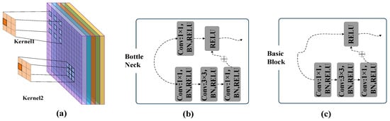 In the part of the remaining encoding process, apart from a series of convolutions, BN, ReLU, and MaxPooling to obtain output, the basic residual block includes multiple bottlenecks and the basic block module is shown in (b) and (c) of Figure 3. The inclusion of these two modules addresses the vanishing gradient problem inherent in DCNNs by introducing cross-layer shortcut connections, making the network easier to train and optimize.