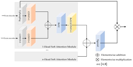 During the encoding process, we employ the multi-head soft attention module, as illustrated in Figure 4. Each attention head within this module functions as a soft attention. Inspired by [,], it encompasses various convolutional operations culminating in a final attention score. This design empowers the model to dynamically allocate attention across features, adapting to the diverse inputs. Unlike conventional attention mechanisms, multi-head soft attention modules can process input representations with spatial dimensions, such as images, feature maps, or other numerical data types. The input from the skip-connection and the input generated by the previous layer are fed into the 1 × 1 convolution, turning them into the same number of channels, because comes from the next layer of , and the size is /2, so is downsampled. After that, they are accumulated and passed through ReLU via another 1 × 1 convolution and sigmoid activation function. The process involves assigning an importance score, ranging from 0 to 1, to every segment of the feature map. Subsequently, this attention channel map is multiplied by the input of the skip connection, leading to the generation of the final output for the attention block. Following this, the outputs of identical 4 or 8 soft attention modules are concatenated, followed by subsequent average pooling across different attention heads. This ensemble ultimately produces the final output.