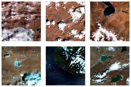 We utilize the ZY-3 cloud dataset provided by []. In terms of data conditions, the quality of cloud datasets plays a crucial role in the training and processing of cloud detection. The variety and comprehensiveness of cloud datasets are of great importance. To enrich the dataset, we augment 1160 images with dimensions of 1024 × 1020 × 3. The newly added images predominantly feature cloud and snow instances within the same scene, as depicted in Figure 5. Notably, these cloud and snow patterns exhibit strikingly similar characteristics in the images, increasing the complexity of the training scenarios. This augmentation aligns more closely with real-world situations encountered in satellite imagery quality assessments. The dataset distribution after augmentation is outlined in Table 1. To ensure the accuracy of data, a meticulous labeling process is employed for the newly added images. In this process, an existing model is used for preliminary feature extraction, followed by manual refinement for each image using Photoshop. This iterative approach ensures the precision of the labels, as human expertise is applied to correct and validate the automatically generated labels. Regardless of cloud thickness, we label pixels as “1” and non-clouds as “0”.