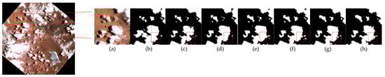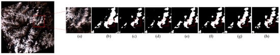Experimental outputs of Cloud Extraction Results using Different models in Image1 (local enlarged in the red rectangle). (a) Raw image; (b) TransUNet; (c) SwinUNet; (d) U-Net; (e) DeeplabV3+; (f) MSACN-small; (g) MSACN; (h) Ground Truth.
