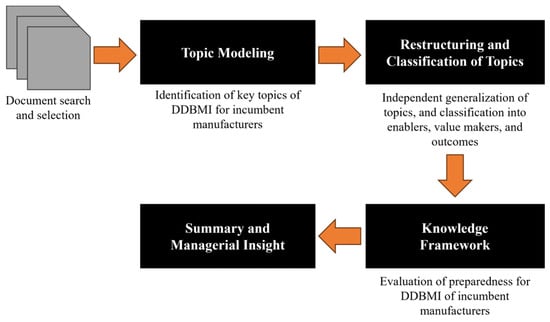 The identified topics from topic modeling for searches and are a combination of mixed and overlapping topics and are discussed in industry-specific contexts. To generalize topics, our four-member team selected topics that can be independently described and generalized for incumbent manufacturers. For the generalization of topics, first, each keyword under each topic is selected from the topic model results of and . The search is specifically employed to harness relevant topics adaptable to incumbent manufacturers’ contexts; however, the search specifies a broader category of incumbents for the DDBMI search.