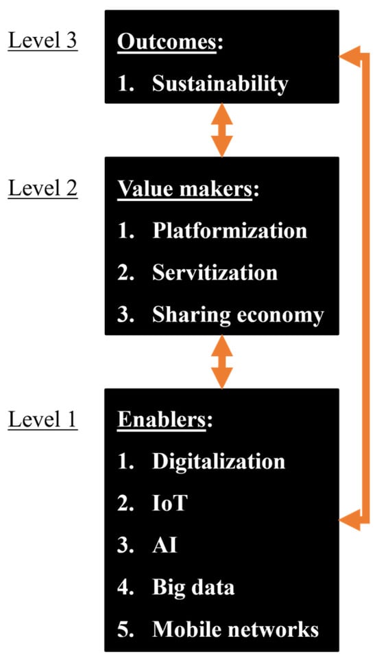 On the second level, value makers (platformization, the sharing economy, and servitization) utilize data to add sustainable value for the company and its stakeholders, including customers, suppliers, or others, contributing to company growth, profitability, resource utilization, and innovation [,,]. Studies discuss the importance of platformization [,,], servitization [,,], and the sharing economy [,] as value makers during DDBMI, which benefit from the enablers. Value makers and enablers share a reciprocal relationship: Enablers empower value makers technologically to add value by providing tools and capabilities to exploit new opportunities, enhance efficiency, improve productivity, and foster innovation [,]. Similarly, value makers prompt enablers to add value for stakeholders by shaping companies through defining business strategies and utilizing technology and data-driven approaches.