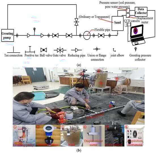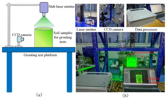 Transparent sand grouting testing system. ((a) a schematic diagram of transparent soil grouting visualization; (b) a test platform for realizing the 3D visualization of transparent soil).
