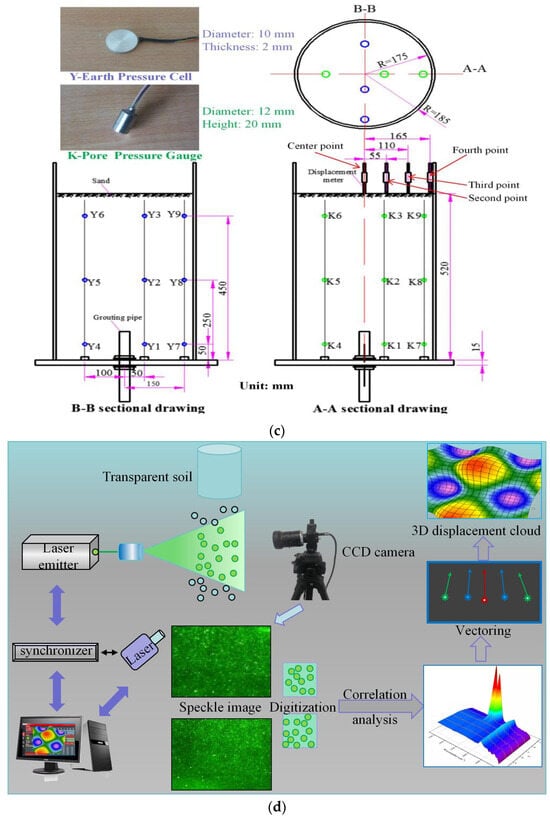 The system of grouting model test. (a) Schematic diagram of grouting test; (b) Grouting device; (c) Pressure measuring device and arrangement; (d) Non-intrusive measurement of displacement during grouting of transparent soil.