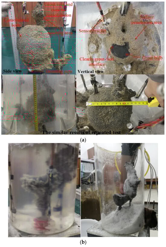 Under the aforementioned experimental conditions, multiple repeated experiments were conducted on medium–dense (void ratio e = 0.73–0.75) ordinary sand. After grouting completion, several sets of typical experimental results were obtained through excavation, as shown in Figure 3. Figure 3a indicates that, in the grouting test of ordinary sand, the grout consolidation body consists of grout stone body, mortar consolidation body, and grout vein body. Similarly, the same results can be clearly observed in the grouting test of transparent sand, as shown in Figure 3b. During the initial stages of grouting pressure, the permeation of grout into the sand dominates. For sand layers with good injectability, the grout generally diffuses through the sand particle medium in a permeation form. The grout effectively fills the pores within the particle framework and ultimately forms a relatively homogeneous grouting reinforcement body with the sand layer. Around the grouting holes in the sand, the grout permeates and expands, forming cohesive spherical stone bodies. This observation aligns with the understanding in engineering practice; as the grouting pressure increases, the compaction effect of the grout in the sand gradually becomes dominant. The grout bubbles expand gradually, exerting pressure on the surrounding soil. With the continuous increase in grouting pressure, when the grouting pressure reaches the strength of the soil at a certain contact point within the sand, cracking diffusion occurs immediately, and the grout rapidly fills the cracked fissures. Since the grouting pressure along the cracked fissures gradually decreases, permeation compaction occurs around the cracked fissures in the initial stage of cracking. As the grouting pressure continues to increase, the grouting pressure within the fissures gradually increases, causing the fissures to expand. Simultaneously, the increase in grouting pressure leads to the gradual expansion of grout bubbles and the generation of new cracks. It is worth noting that as the grouting pressure increases, when the pressure reaches a certain value, the phenomena of grout penetration, compaction, and cracking diffusion coexist. This finding is consistent with the conclusions of Yang et al. [].