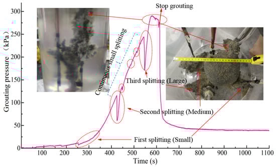 The relationship between grout diffusion and grouting pressure variation, as shown in Figure 4, was obtained by comparing the measurement of grouting pressure and observation of grout diffusion on the same time during the experiment, resulting in the curves and images depicted in Figure 4. The grouting pressure curve indicates that, when compaction diffusion predominates, the grouting pressure variation curve exhibits a smooth characteristic. However, during low-pressure infiltration, the grouting pressure curve is non-smooth. This may be due to the presence of pore water pressure in the sand soil pores (caused by the existence of excess pore water pressure during soil filling), which varies in size. Consequently, during each infiltration and crack occurrence, there is a significant drop in grouting pressure. Subsequently, the increase rate of grouting pressure after the sharp drop exceeds the increase rate before the drop, as can be directly observed from the average slope of the tangent lines of each segment of the grouting pressure curve. The starting and ending points of each segment exhibit distinct features in the graph, presenting a convex tip at the end of the pressure curve. Figure 4 further verifies the previous analysis regarding the formation of the stone structure. When the grouting pressure is relatively low, the diffusion of grout in the soil is mainly dominated by infiltration, with compaction as a secondary process. As the grouting pressure gradually increases, after the first minor fracturing, grout diffusion is primarily dominated by compaction, with infiltration as a secondary process. This continues until the occurrence of the second fracturing. Due to the compaction effect of the grout around the bubble, the permeability decreases, and, thus, infiltration mainly occurs around the fracturing grout veins at this point. After the second major fracturing, the higher grouting pressure reaches the surrounding soil’s resistance to fracturing. At this point, the grout diffusion is primarily dominated by fracturing, with compaction and infiltration around the grout veins as secondary processes. Consequently, continuous minor fracturing occurs. From the second fracturing to the third major fracturing stage, the pressure curve is no longer smooth, showing more concave endpoint characteristics. This further illustrates that grout diffusion in the soil is primarily dominated by fracturing, which is more visually observable in transparent sand, emphasizing the fracturing phenomenon.