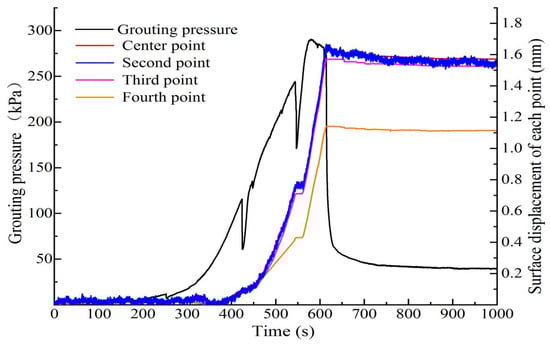 While observing the temporal variations in the grouting pressure curve, significant characteristics are also evident in the changes in surface displacement caused by grouting, as shown in Figure 5. Both the grouting pressure and surface displacement exhibit good consistency in their temporal variations, showing a gradual increase followed by rapid growth with increasing grouting time. After the completion of grouting, the final surface displacement shows a larger displacement at the center (central measuring point) compared to the edges (fourth measuring point). In this experiment, the difference in displacement between the central point and the second and third points is relatively small, because these three points are located within the horizontal range of the grout bulb. The fourth measuring point, however, is located outside the horizontal range of the grout bulb, indicating that the grout is more effective in lifting the surface within the range of the grout bulb, while the lifting effect outside the grout bulb range is relatively smaller. The surface uplift displacement curves for the four measuring points (from the center to the fourth measuring point) exhibit similar characteristics. There is a nearly horizontal displacement–time development segment in the grouting displacement curve corresponding to the peak of grouting pressure (grouting fracture). The four displacement curves show a “stepped” growth pattern with increasing grouting time, and the speed of increase accelerates after each step, indicating a distinct stage-wise characteristic in the surface uplift displacement curves with the increase in grouting time.