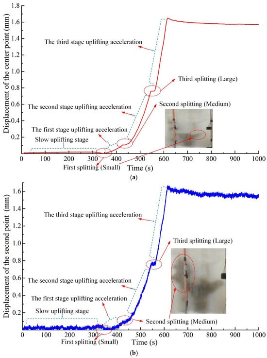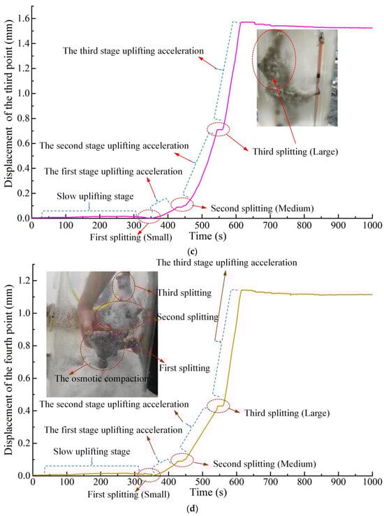 To more intuitively analyze the stage-wise characteristics of surface uplift displacement with respect to grouting time and its relationship with grout diffusion, the uplift displacement–grouting time development curves for the four measuring points are obtained based on the visualization images of grout diffusion in transparent sand, as shown in Figure 6.