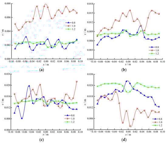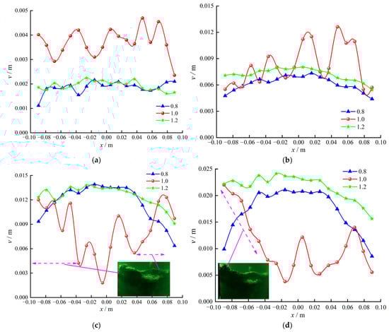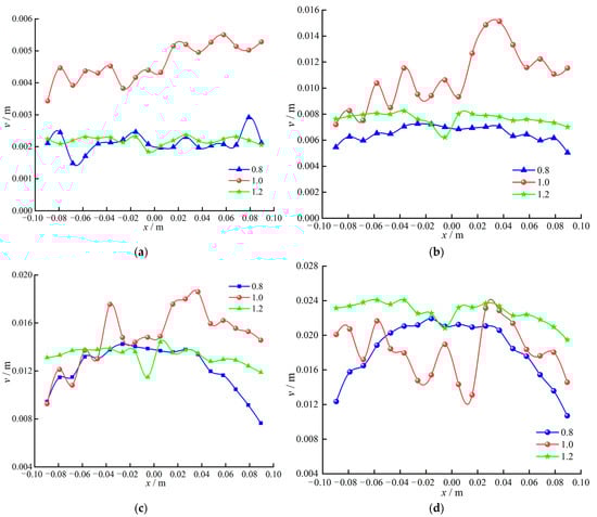Transparent sand grouting tests were conducted with three water–cement ratios (w/c = 0.8, 1.0, 1.2). To maintain consistency in the experimental sand parameters, the sand filling height was set at 300 mm, and the natural consolidation time was standardized to 24 h. The laser was directed from top to bottom to avoid the influence of the model bucket on laser penetration and to minimize the occlusion of the laser beam by the grout, primarily focusing on monitoring the vertical displacement of the sand layer. To obtain the dynamic deformation characteristics during the grouting process in transparent sand, different w/c of grout were selected at four time points (0.25 t, 0.50 t, 0.75 t, t) based on grouting time (t), and the uplift displacements (v) of sand at three heights (burial depth h) from the ground surface (0.15 m, 0.10 m, 0.05 m) were analyzed. At each height, 18 data points were extracted along the horizontal direction at equal intervals. The dynamic deformation characteristics of transparent sand during the grouting process can be obtained, as depicted in Figure 7, Figure 8 and Figure 9.