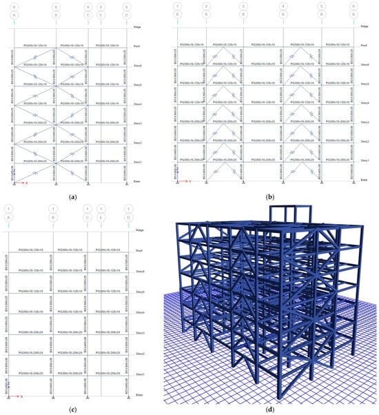 Di Sarno and Elnashai (2009) investigated the seismic performance of steel moment-resisting frames (MRFs) retrofitted with various bracing systems. The main MRF was designed with a lateral stiffness that did not accompany drift limitations in severe seismic regions. The bracing systems were special concentrically braced frames (SCBFs), mega-braces (MBFs), and BRBFs. Their combination led to eight retrofitted models [43].