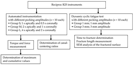 Thirty resin canal blocks were subjected to manual glide path creation with a working length of 16 mm using #10 and #15 stainless steel K-files (Zipperer, Munich, Germany) by one operator (KH). Then, the blocks were randomly assigned to three groups based on the pecking amplitude (n = 10 each): (1) small-amplitude group (Group S; 1 s apically and 0.5 s coronally); (2) medium-amplitude group (Group M; 2 s apically and 1 s coronally); and (3) large-amplitude group (Group L; 4 s apically and 2 s coronally).