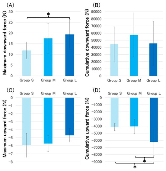 (A,B) Downward force and (C,D) upward force generated during Reciproc Blue instrumentation with different pecking amplitudes. (A,C) Maximum values and (B,D) cumulative values. Group S: small-amplitude group (1 s apically and 0.5 s coronally); Group M: medium-amplitude group (2 s apically and 1 s coronally); Group L: large-amplitude group (4 s apically and 2 s coronally). Downward and upward forces are represented by positive and negative values, respectively. The values indicate the mean and standard deviation (n = 10). * p < 0.05.