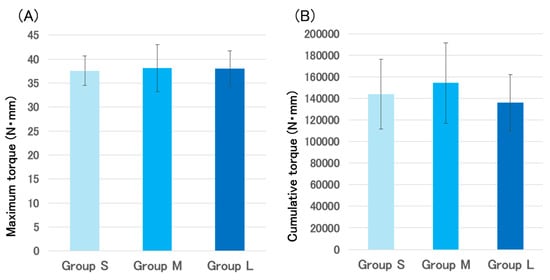 The maximum downward force values generated by Group S were significantly lower than those generated by Group L (p < 0.05). Additionally, the cumulative upward force generated by Group L was significantly higher compared with that generated by other groups (p < 0.05) (Figure 2). There were no significant differences in the maximum or cumulative torque values across all groups (Figure 3).