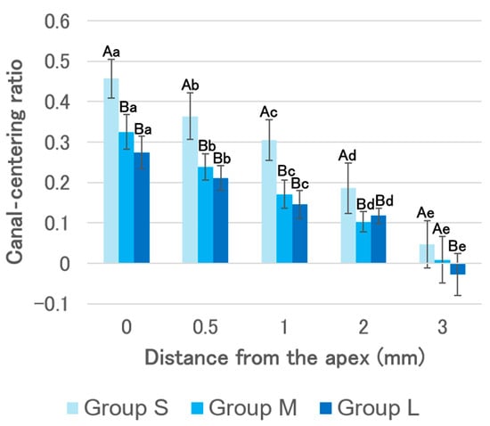 For the canal-centering ratio, Group S exhibited significantly higher values compared with Group M and Group L at the levels of 0, 0.5, 1, and 2 mm from the apex (p < 0.05) (Figure 4).
