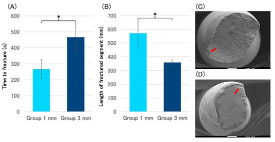 The dynamic cyclic fatigue test results revealed that Group 3 mm exhibited significantly greater time to fracture compared with Group 1 mm (p < 0.05; Figure 5A). The length of the fractured segment was significantly longer in Group 1 mm compared with Group 3 mm (p < 0.05; Figure 5B). The fractured surface exhibited the typical fractographic pattern of cyclic fatigue failure, characterized by the presence of numerous dimples spread across the entire surface (Figure 5C,D).
