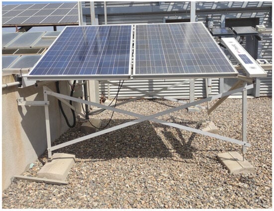 The experimental setup is located on the roof of the Solar Energy Research Centre (CIESOL) at the University of Almería (Spain) ( N, W, at sea level). It consists of two south-oriented silicon polycrystalline photovoltaic panels, ATERSA A222-P, whose electrical characteristics are displayed in Table 1, with the same angle of inclination () as a nearby photovoltaic plant with a power of . For data collection, it was necessary to maintain the western one regularly, while the eastern one was kept maintenance-free (see Figure 1) to measure the difference in the short-circuit current between them both based on the shunt resistance. This difference is attributed to the accumulation of dust on the western panel, which reduces its short-circuit current output.