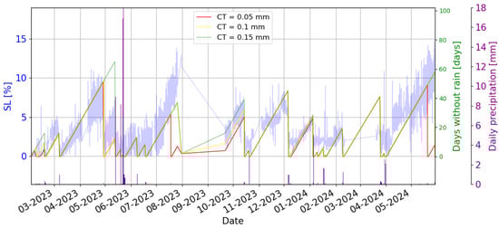 The CT that adjusted best to the soiling loss measured in Almería, Spain, in this experiment was 0.1 mm/day, as seen in Figure 2, which shows how three different CTs affect the computed variable DSLR and how these different DSLR computations fit the soiling losses calculated earlier.