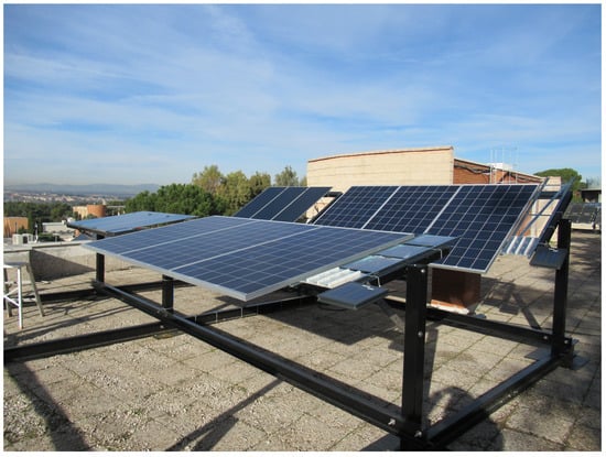 For generalisation purposes, data from a similar experiment carried out at CIEMAT, a research centre in Madrid, were used. The experimental facility consisted of three multi-crystalline silicon PV modules (Figure 3), with 263.7 Wp. One of them, which was considered the reference module, was cleaned weekly, while the others were exposed to environmental conditions without any cleaning at all, apart from natural cleaning by rain. Additional information on the CIEMAT facility and modelling efforts for soiling loss determination can be found in the literature [,,]. The procedure used to determine soiling loss was the same as that used in the CIESOL facility (Equation (1)).