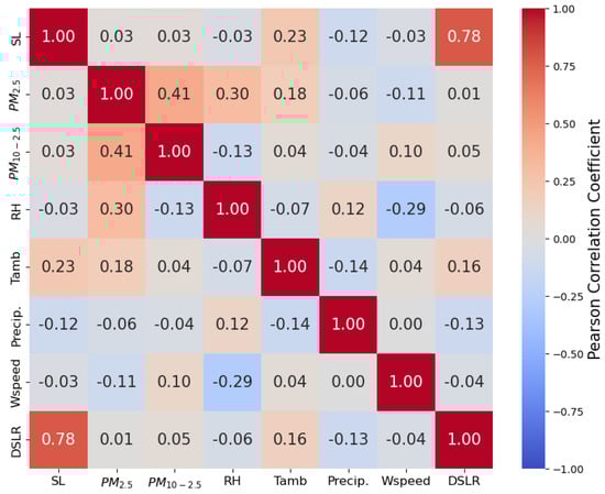 To determine the correlation between all variables, and specifically between different characteristics and the target variable (soiling losses), Pearson’s correlation coefficient was calculated, as illustrated in Figure 4. This statistical measure helps to assess the linear relationship between pairs of variables. In particular, the correlation between soiling losses (SLs) and DSLR stands out with a coefficient of 0.78, indicating a strong positive relationship. Furthermore, the correlation between relative humidity and PM2.5 is 0.30, suggesting a moderate association. The remaining features did not show a strong relationship with soiling losses, which highlights the benefit of using machine learning methods. Unlike simple correlation measures, machine learning can identify complex, non-linear relationships between variables. This ability helps uncover patterns and connections that are not immediately obvious, improving the accuracy and effectiveness of the analysis for predicting soiling loss.