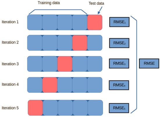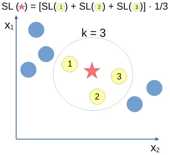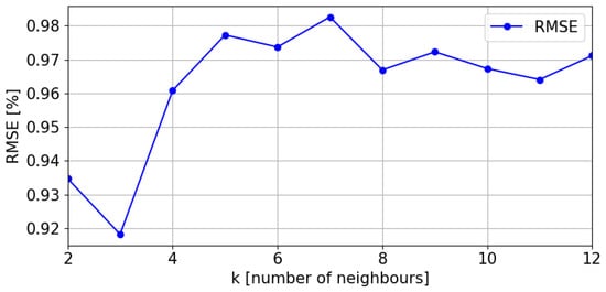 With the aim of determining the parameter k, K-fold cross-validation and grid search have been performed. Five-fold cross-validation involves dividing the training dataset into five subsets, using four for training and one for testing in rotation to assess model performance, as shown in Figure 5. For grid search, GridSearchCV algorithm was used. This algorithm systematically searches through a specified parameter grid to find the optimal hyperparameters for a model by using cross-validation. By utilizing this algorithm to vary the number of neighbours (parameter k in kNN) from 2 to 12, a cross-validation RMSE error ranging between and was obtained. The lowest RMSE was achieved when k was set to 3, as illustrated in Figure 6. Therefore, 3 was selected as the optimal value for this parameter. The selected metric for assessing distance calculations is Euclidean. Predictions for kNN with k set to 3 are depicted in Figure 7. Each axis represents an indeterminate feature. To estimate SL, the algorithm identifies the three nearest neighbours by measuring the Euclidean distance between instances based on these features. The instances closest to the star shape are the nearest neighbours (shown as yellow circles). The estimated SL value is determined by averaging the SL values of these three neighbours.