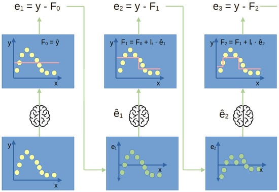 Gradient boosting is a machine learning technique that builds an ensemble of weak learners, typically decision trees, in a sequential manner in which each new tree corrects errors made by the previous ones. A simple gradient boosting model with trees of depth one is depicted in Figure 8. For each iteration, it calculates the residuals (errors) between the actual values and the current predictions. Then, a tree is fitted to these residuals. The predictions from this tree are then scaled by a learning rate and added to the existing model predictions. This process is repeated for a predefined number of iterations, gradually improving the model by reducing the residuals step by step. Two models that fall into the category of gradient boosting have been developed for soiling losses estimation using LightGBM and CatBoost algorithms.
