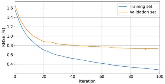 CatBoost is a gradient boosting algorithm developed by Yandex []. Its main objective is to handle categorical variables during the training phase using a developed algorithm, rather than addressing them in the data preprocessing phase, as is common. Although the database used in this article for the regression task of predicting soiling losses does not contain any categorical variables, CatBoost has been employed for its ability to deliver good results with default parameters and its built-in early stopping system to prevent overfitting. The parameters for this model are listed in Table 7. Using the built-in overfitting detector based on early stopping, the model was trained by growing trees until an iteration failed to produce an improvement greater than the od_pval threshold. As shown in Figure 9, no additional trees were grown after iteration 90.