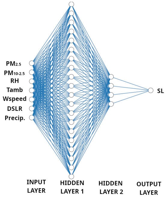 In this work, an ANN was selected over more complex deep learning architectures because of the moderate dataset size (266 samples), where simpler models are less prone to overfitting. Prior studies applying ANNs to predict PV soiling losses have typically used a single hidden layer [,]. However, to increase flexibility in capturing non-linear interactions between environmental variables, we used two hidden layers. The number of neurons in each hidden layer, along with the batch size, was optimised through grid search with five-fold cross-validation, systematically testing different configurations to minimise the validation error, using the mean absolute error as a loss metric. The final architecture consisted of 20 neurons in the first hidden layer and 4 in the second, offering a strong balance between model capacity and generalisation. The ANN takes seven standardised input features, has a single output neuron estimating soiling loss, and uses sigmoid activation throughout (Figure 10). Input data were standardised using Equation (3) to ensure consistent scaling.