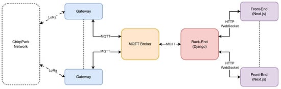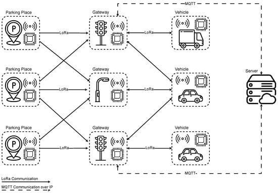 In our system we, identified three main actors: vehicles, gateways (streetlights, traffic lights, signals, etc.) and parking sensors. All the elements exchange messages through the LoRa protocol []. In particular, as we explain in the next section of this work, the protocol can integrate the use of MQTT when an Internet connection to a remote server is available or required. It can happen, for example, when a custom application is developed for real-time observation or data analysis (see Section 4.2 and Section 5.3).